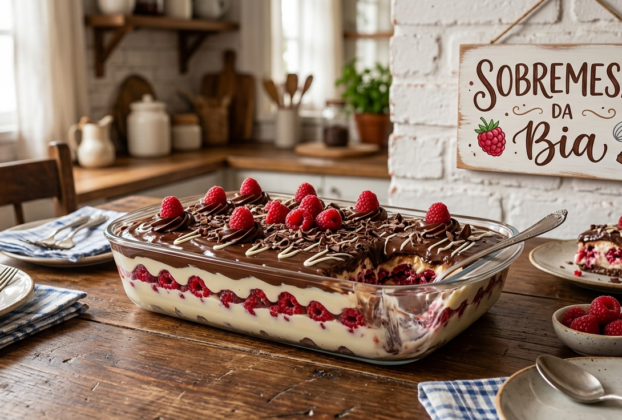 Ingredientes: Para o Creme Branco: Para a Camada de Fruta: Para a Cobertura (Ganache): Modo de Preparo: Dicas Adicionais da Bia: 💡 Aproveite cada colherada dessa delícia! 🍓❤🍫